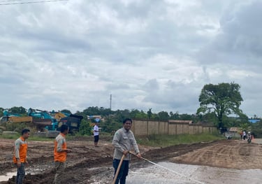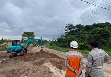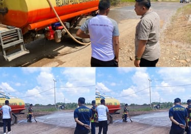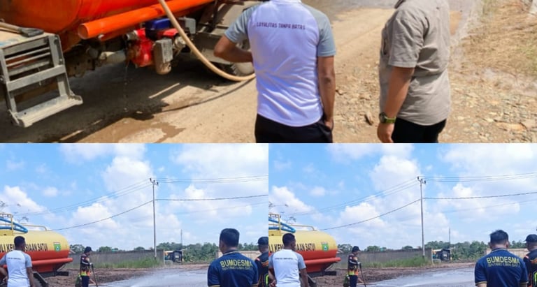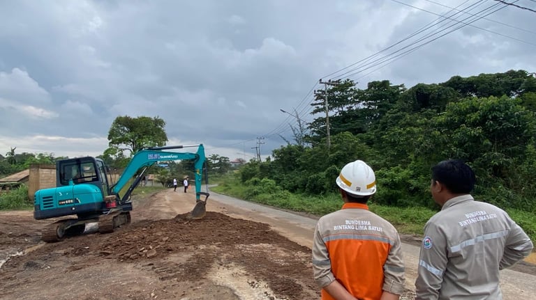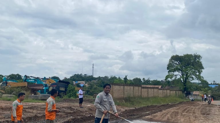 BBL Bersama Pemerintah Desa Makmur Jaya menggandeng Relawan untuk melakukan pembersihan jalan di area perkantoran kecamatan (Jl. Idham Chalid Kecamatan Satui) dengan menggunak alat exca dan unit penyiraman dari Relawan